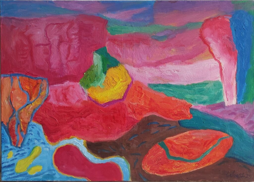 Pejzaż męski / Masculine landscape, 100x88 cm. Oil on cotton, 2025.