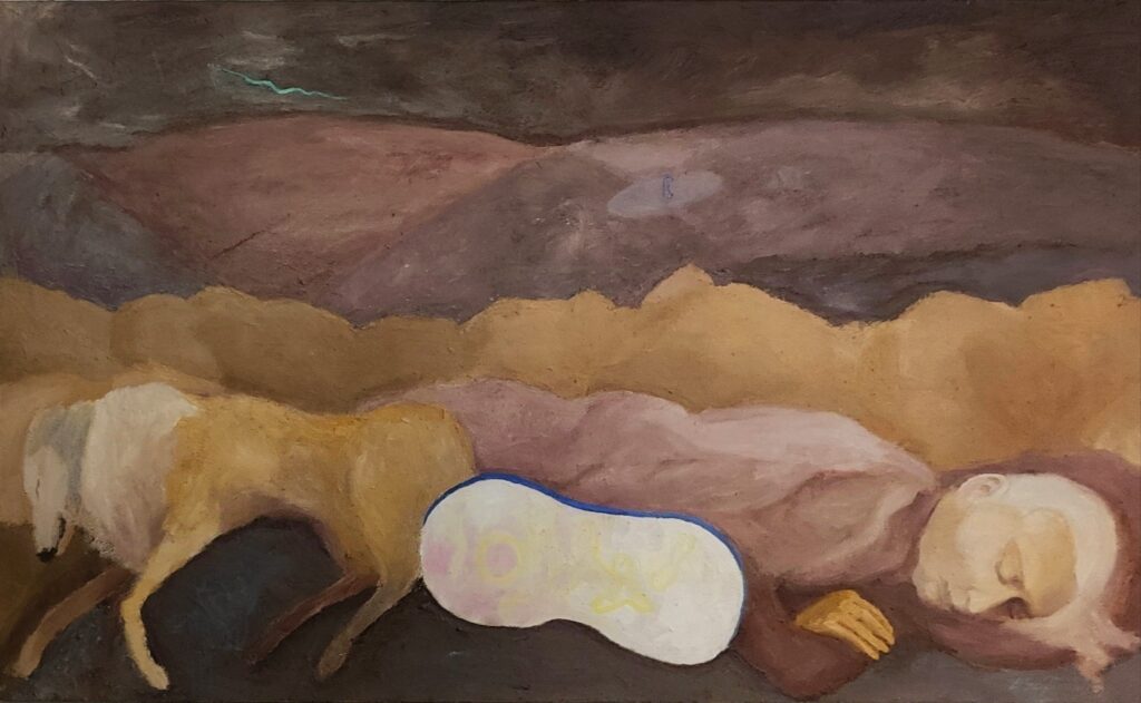Sikający pies / Peeing dog, 68x98 cm. Oil on cotton, 2025.